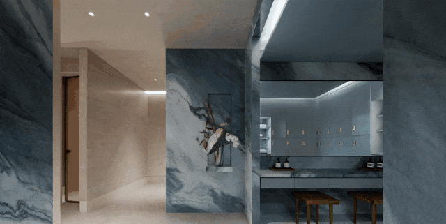 进入室内的入户玄关收纳空间,地面采用静雅棕、宝格丽兰石材拼花设计,古典回形波打+实心铜条的搭配增强入户尊贵感。右侧是山水白奢石的开放格,左侧是行李间,通过暗门的做法,将功能结合进去,强化了归家的仪式感。