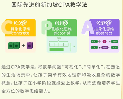 退出学而思后,经朋友推荐,我抱着试试看的心态接触了Mathplore新加坡数学。起初我心里是犯嘀咕的:这也太简单了吧?画那么多图,知识点也不深,真能学好数学吗?结果跟了几节课后,我被它的教学思路深深折服了——原来数学真的可以不用死记硬背,还能这么生动有趣。这一切的核心,都归功于新加坡数学独有的“CPA教学法”,简单说,就是通过三个步骤帮孩子搭建数学思维的脚手架。