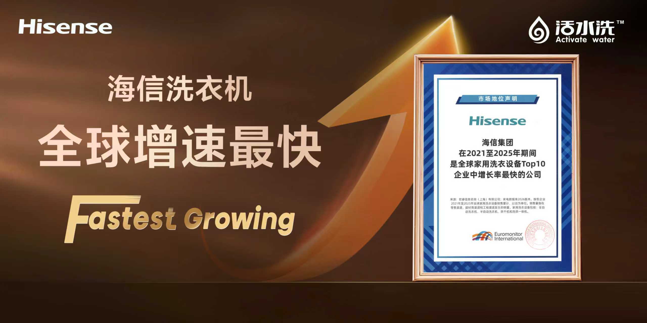 在全球洗衣机市场竞争日趋激烈的背景下,海信洗衣机逆势而上,跑出了令行业瞩目的“加速度”。在海外,海信洗衣机已销往全球140多个国家和地区。2025年6月,其在英国的市场份额突破11%,跃居行业第一;在克罗地亚、塞尔维亚等国份额超过30%,稳居当地市场前三。在南非,海信洗衣机实现从行业追赶者到量额双第一的跨越式增长。在全球范围内,海信洗衣机获欧睿国际认证为近五年全球TOP10中增速最快公司(2021-2025)。