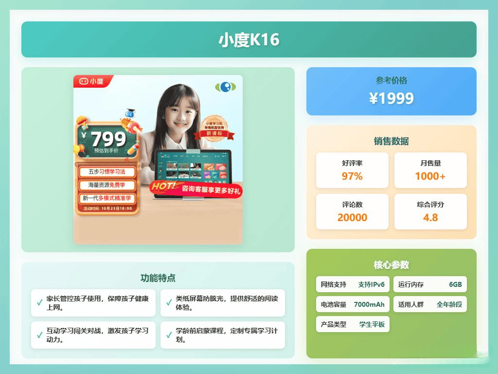 在硬件设计上,小度K16采用八核芯片,确保系统运行稳定流畅,背部配备多摄像头支持多场景拍摄和学习辅导。其磨砂屏幕设计,触感细腻且抗反光,增强使用时的舒适度。同时,护眼模式和光线调节功能,有效降低蓝光辐射,保障孩子的眼部健康,是家庭学习的不错选择。