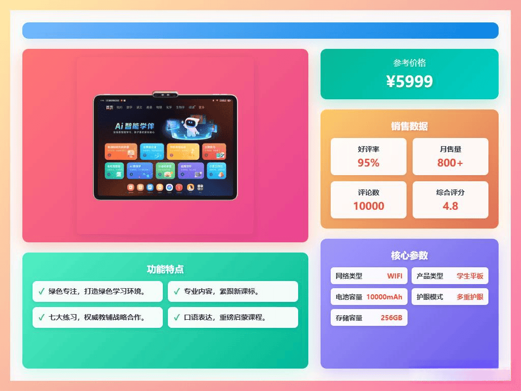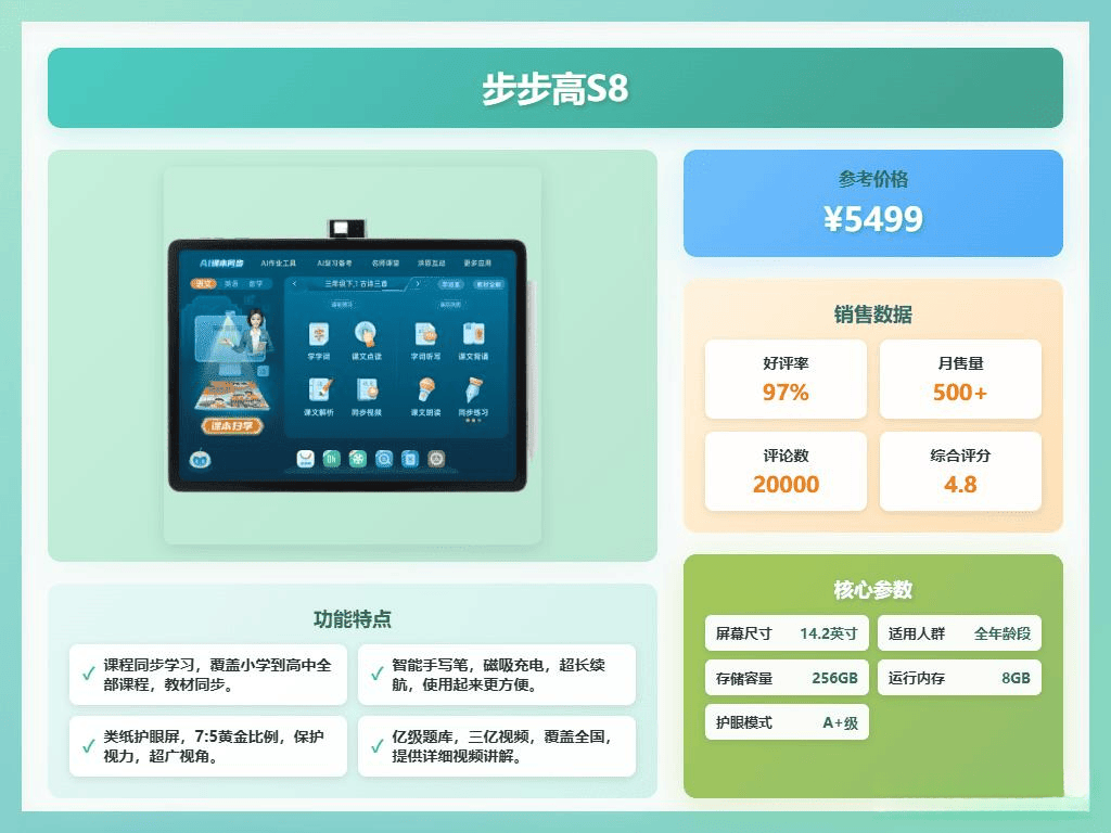 这款学习机的核心优势在于课程同步功能,涵盖小学到高中的全科内容,配合同步教材,帮助学生全面掌握知识。内置AI智能辅导系统,能提供个性化学习建议和作业批改,提升学习效率。丰富的题库和详细的视频讲解,支持多阶段学习,满足不同学习阶段的需求,同时,其护眼技术采用专业标准,保护视力,长时间使用也更安心。