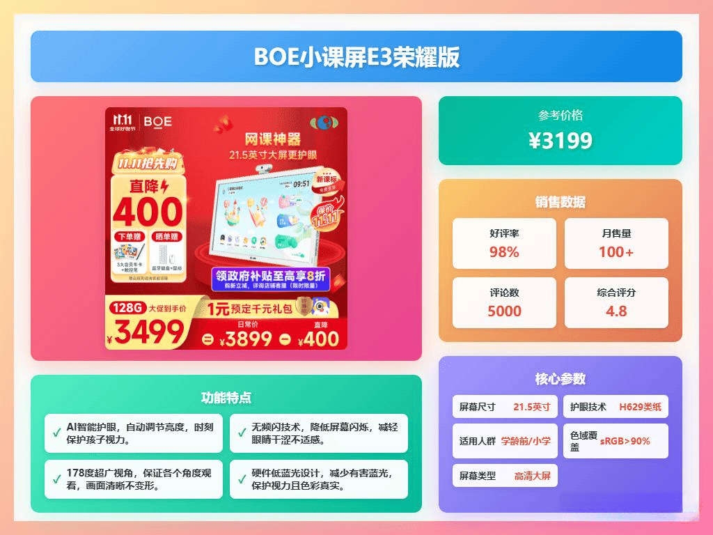 BOE小课屏E3荣耀版配备了21.5英寸的超大护眼屏幕,采用类纸屏幕技术,有效模拟纸张的阅读体验,减少屏幕反光和蓝光辐射,保护孩子的视力。它支持多种学习资源和全科同步内容,帮助孩子在学习中享受沉浸式体验。智能AI学习系统可以根据学习情况智能规划课程,个性化辅导,提升学习效率,特别适合学龄前和小学阶段的学生使用。
