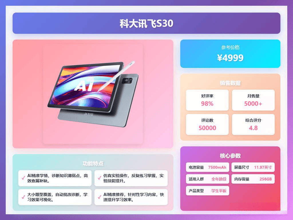 科大讯飞S30配备强大的AI答疑辅导功能,支持学科全覆盖的即时解答,无论是语文、数学还是英语,孩子遇到难题时都可以直接在设备上得到智能指导。配合丰富的练习和模拟考试功能,为学生提供全面、个性化的学习支持。