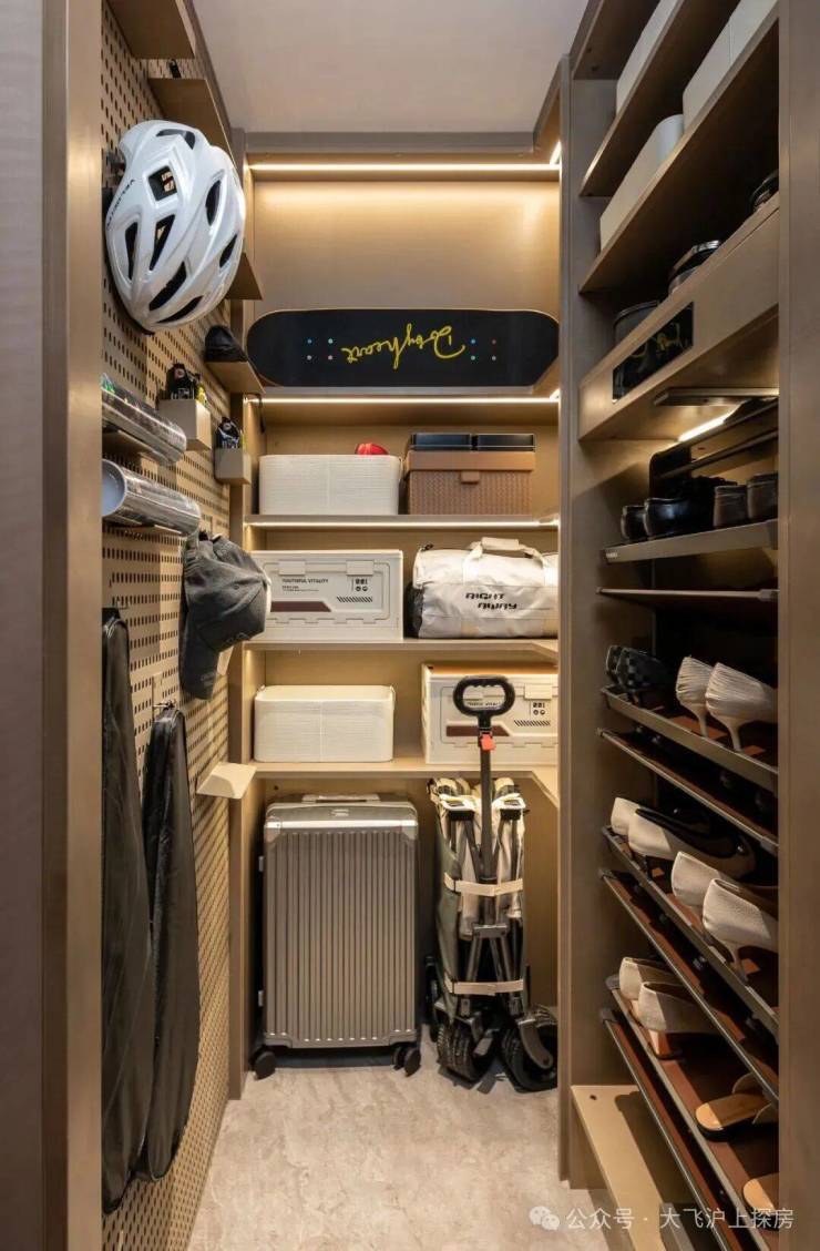 例如进门玄关采用储物间暗门+墙面烤漆板智能面板一体化设计,单独设置了一个“八百库”收纳间,实现杂物全部隐身!内部设置洞洞板墙、不同高度层板,增加收纳丰富性,还预留行李箱/自行车/儿童玩具空间,细节考虑满分~
