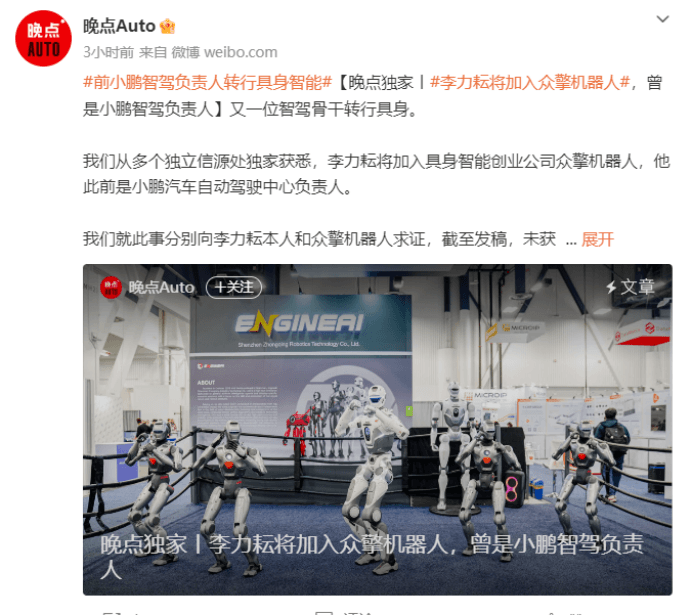 4月15日,据晚点LatePost从多个独立信源处独家获悉,小鹏汽车原自动驾驶中心负责人李力耘将加入具身智能创业公司众擎机器人。李力耘的加入,既体现了智能驾驶核心技术人才向人形机器人领域流动的行业趋势,也凸显了具身智能赛道对顶尖技术人才的吸引力。另一方面,李力耘与赵同阳此前同属小鹏系,此次再聚首,可能进一步加速众擎在机器人智能决策、感知与规划算法等领域的技术突破。