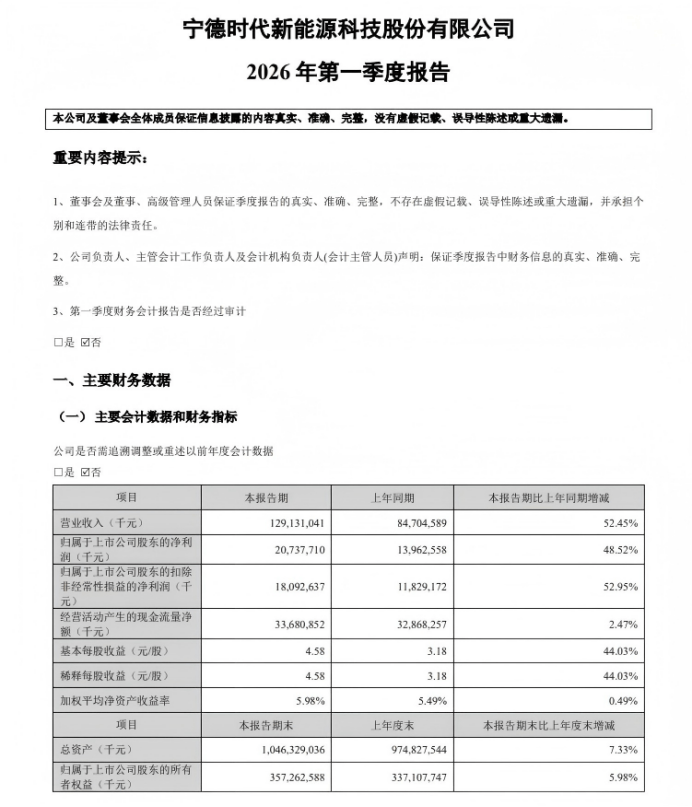 第一电动4月15日消息,宁德时代发布2026年第一季度报告。报告显示,公司一季度实现营业收入1291.31亿元,同比增长52.45%,首次单季突破千亿元;归母净利润207.38亿元,同比增长48.52%;扣非净利润180.93亿元,同比大幅增长52.95%。基本每股收益4.58元,加权平均净资产收益率5.98%,经营活动现金流净额336.81亿元,现金流保持充裕。