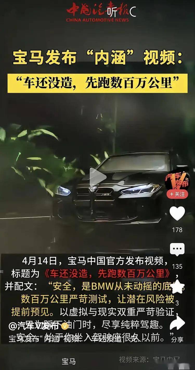 4月15日有网友发帖,宝马发布视频,内涵某车企“车还没造,就路测了几百万公里”。